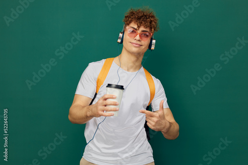 man in gray clothes stands on a background listening to music with headphones with bright glasses and a backpack on his back holding a cardboard glass in his hand and pointing at it with his finger