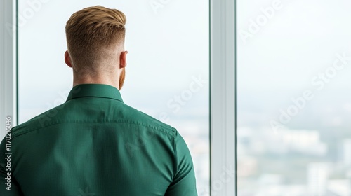 Man in Green Shirt Staring Out Window Overlooking Cityscape at Daytime