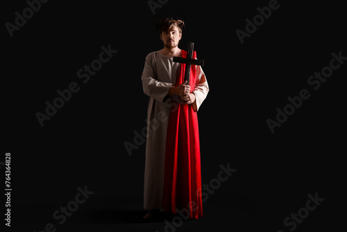 Man in Jesus robe and crown of thorns holding wooden cross with light on black background