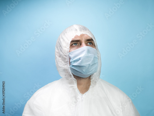 Man in medical mask wearing protective uniform on blue background. Covid 19 quarantine concept