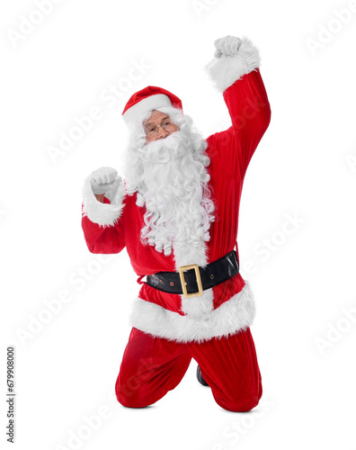 Man in Santa Claus costume posing on white background