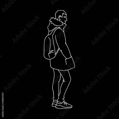 Man in warm jacket, jeans and sneakers. Side view. Monochrome vector illustration of young man with backpack standing and smiling in simple line art style. Hand drawn white lines on black background.