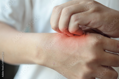 man itching and scratching on hand from insect bite or itchy dry skin eczema dermatitis