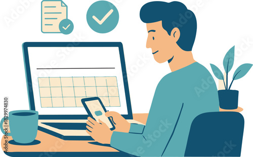 Man managing schedule and tasks using smartphone and laptop.