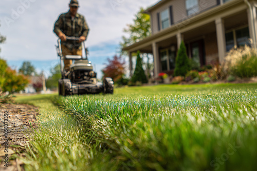 Man mowing green lawn in front of suburban house with lawnmower on sunny day outdoors