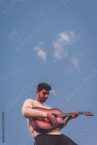 man playing guitar with blue sky in the background - white clouds