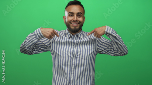 Man pointing both index fingers to his striped shirt while smiling in green studio; confidence pride.