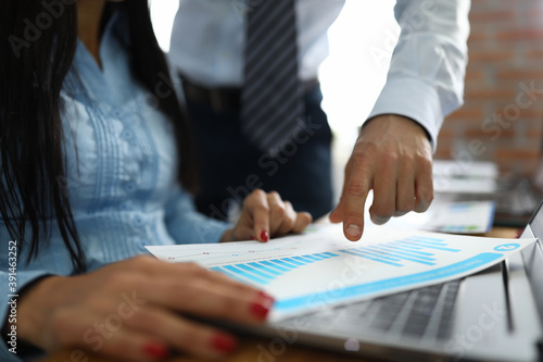 Man points to woman on commercial business charts. Graph analysis methods for companies concept