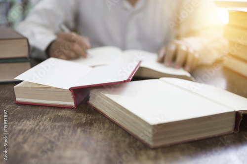 man reading book with textbook stack on wooden desk