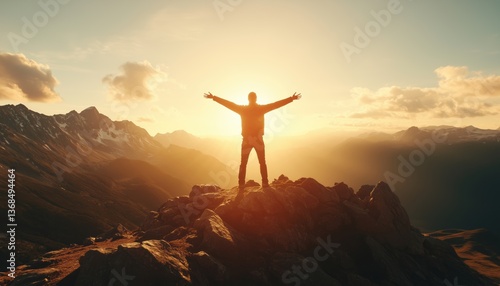 Man Rejoicing On Mountain Peak In The Presence Of Sun. Celebrating The View From His Elevated Vantage Point, Filled With Joy.