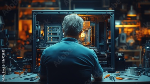 Man repairing a computer inside a workshop.
