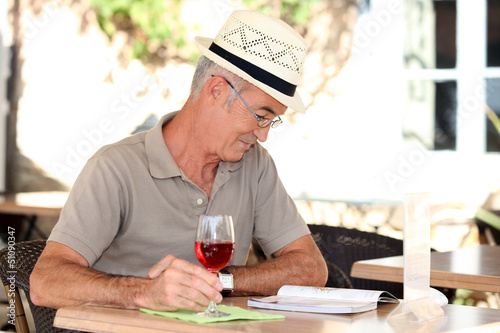 Man sat reading book on terrace