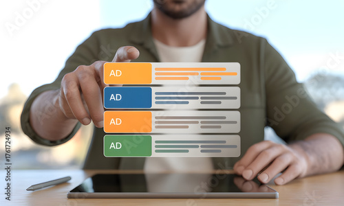 Man selects digital ad campaign on tablet for modern marketing strategy success