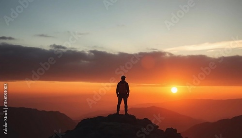Man Silhouetted at Sunset Mountain Peak Success Adventure