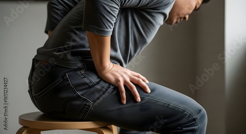 Man sits on stool with hand on thigh wearing gray shirt and jeans with back pain leaning forward