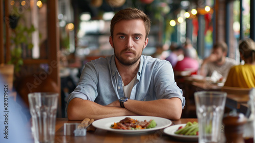 Man sitting at restaurant table, plate of meal in front of him, bad food taste, unhappy displeased customer, dissatisfied with service, negative disgust face expression