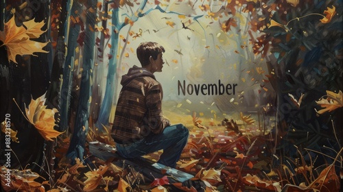 Man Sitting on Log in Forest Surrounded by Falling Leaves in November