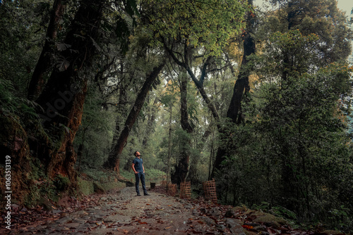Man Standing Alone in Dense Jungle Pathway