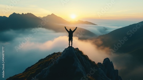 Man Standing on Mountain Top at Sunrise