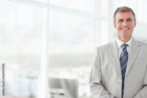 Man standing smiling in office in suit jacket, striped tie with desk, windows behind, copy space