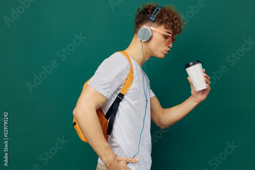 man stands on a green background listening to music with headphones with bright glasses and a backpack on his back holding a cardboard glass for hot drinks in his hand, standing sideways to the camera