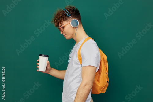 man stands on a green background listening to music with headphones with bright glasses and a backpack on his back holding a cardboard glass for hot drinks in his hand, standing sideways to the camera