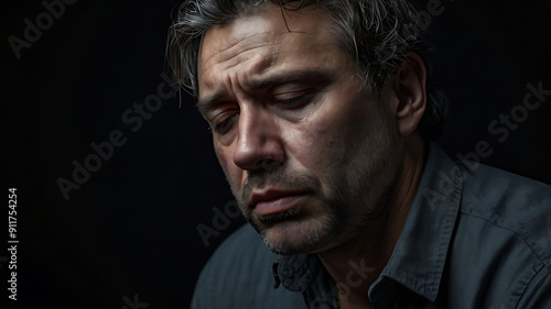 man suffering from depression looking down on black background
