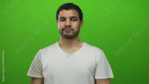 Man tilts head in studio with green background and neutral expression, eyes closed in relaxed pose; calm introspection.