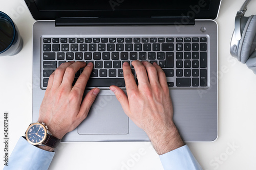 Man typing a laptop keyboard while working, he has tea cup on top left corner and headphone on top right corner. Top point of view.