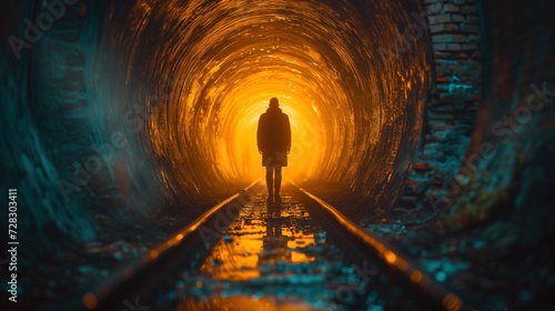man walking through a dark tunnel