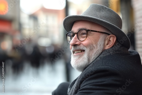 Man wearing a hat and glasses smiles outdoors with blurred background.