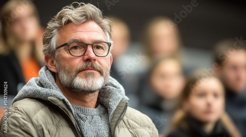 Man with glasses in a crowd, focused on an event.