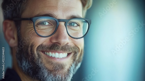 Man with glasses smiles warmly while sitting in a well lit indoor space, exuding positivity and warmth