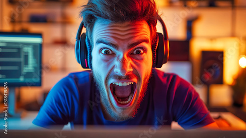 Man with headphones looks surprised at computer screen
