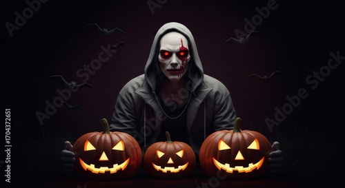 Man with zombie makeup and glowing red eyes in a hoodie with three glowing carved pumpkins and flying bats for Halloween horror concept.