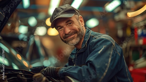 man working in auto repair shop and smiling.