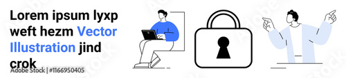 Man working on laptop, large padlock symbol, and person explaining ideas. Ideal for technology, security, communication, collaboration, remote work data privacy and digital environments. Landing