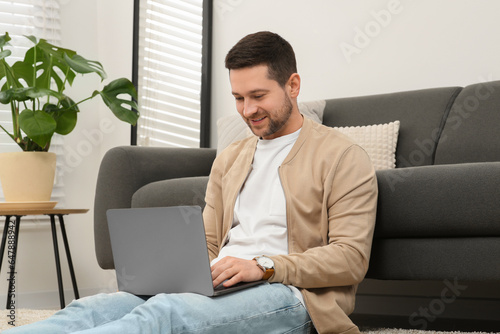 Man working with laptop on floor at home
