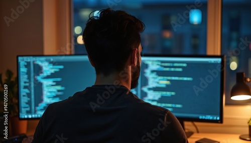 Man works late night on computer. Programmer, developer coding software, web design. Coding on computer screen at night, work desk, software development, modern tech, business, cyberspace.