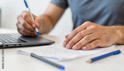 Man writing with adaptive tools in minimalistic workspace, empowerment