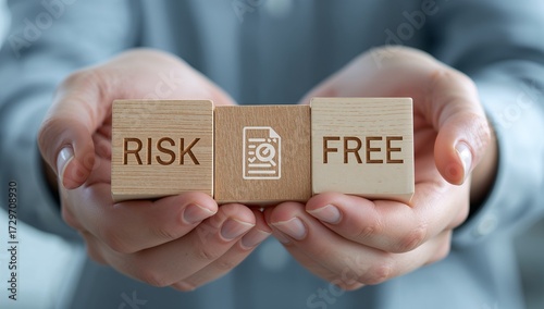 Manager holding wooden blocks sees inscription: RISK FREE. Effective risk management, measurement, monitoring, assessment and control. Risk Free Rate 100% Satisfaction Guarantee Concept. control