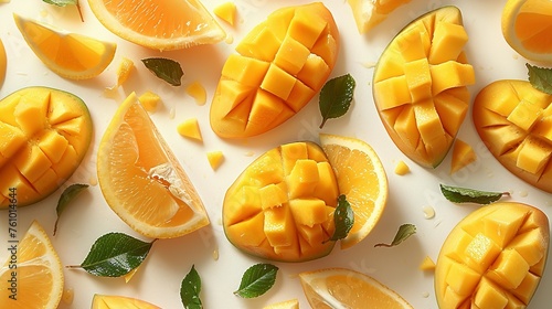 Mango fruit and half with slices isolated on white background. Top view. Flat lay