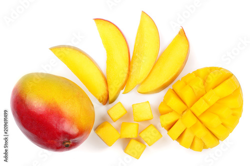 Mango fruit and slices isolated on white background close-up. Top view. Flat lay