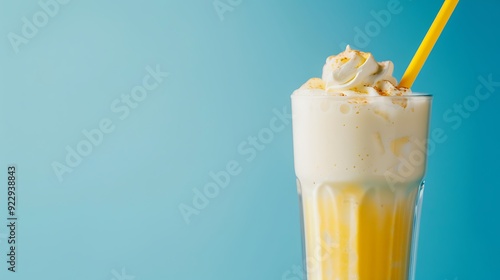 Mango milkshake with yellow straw isolated on a blue background