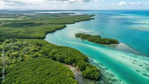 Mangrove sustainability, Aerial view of lush green coastline and turquoise waters. Protect coastal foreshores.