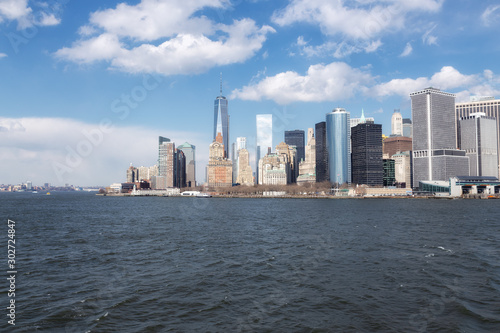 Manhattan midtown skyline panorama over East River with urban skyscrapers and blue sky with clouds in New York City