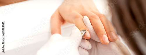 Manicure master uses manicure clippers removing cuticles on female nails in a beauty salon close up