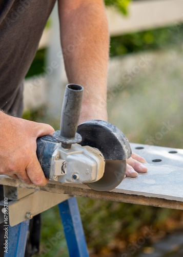 Mann schleift mit einem Winkelschleifer eine Fliese