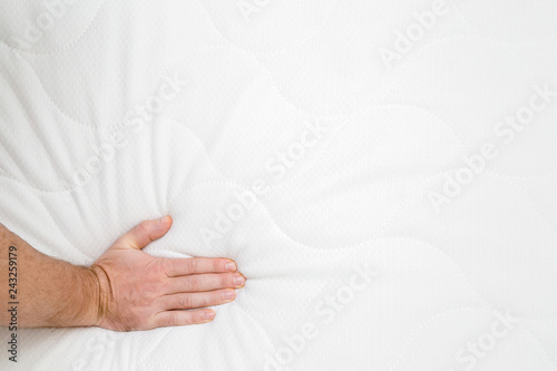 Man's hand pressing on white mattress. Checking hardness and softness. Choice of the best type and quality. Copy space. Empty place for text or logo. Top view. Close up.
