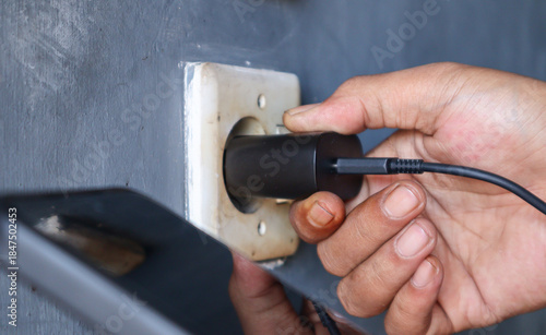 Man's hand view plugging a mobile phone charger cable into a wall socket. Ready to connect, plug in electricity